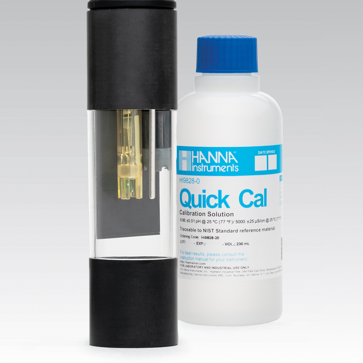 Perform speedy, single point calibration for pH, conductivity, and dissolved oxygen using the supplied calibration beaker and provided Quick Cal solution.