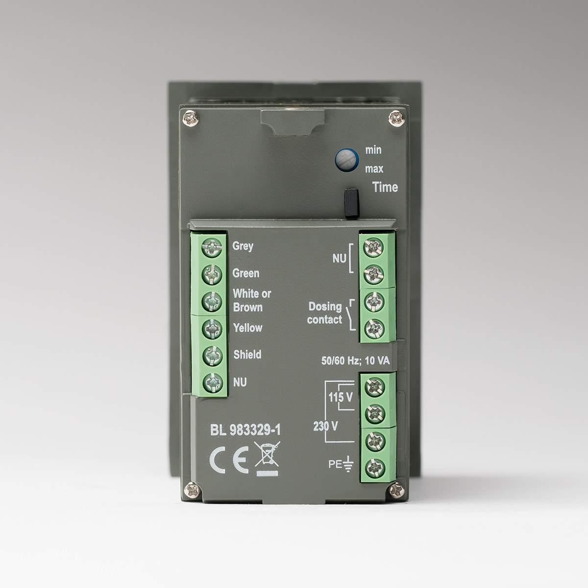 The BL983329 features a dosing relay that is activated when the reading is above a user programmable set point.